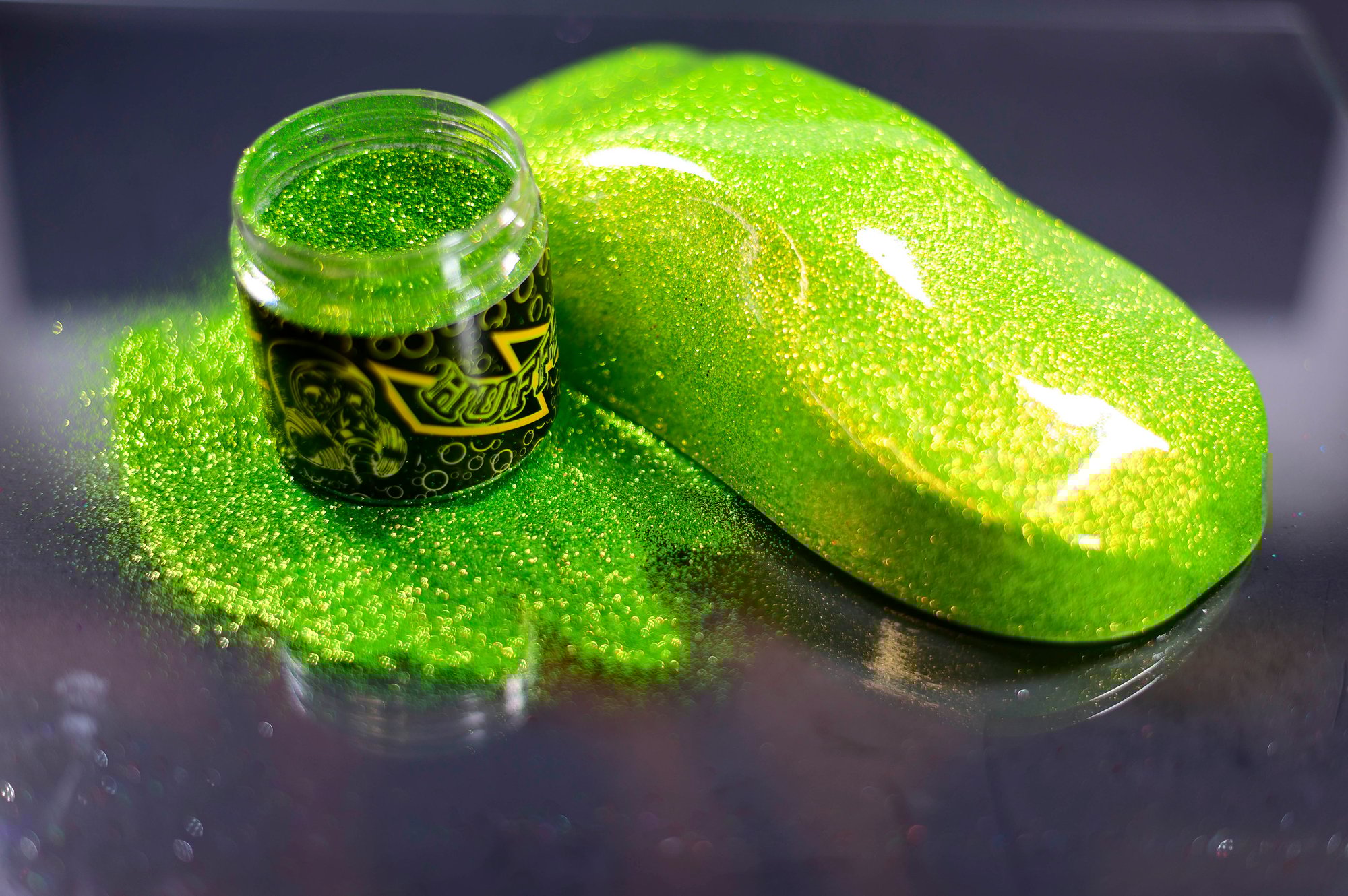 CENTIPEDE!! Our brand new addition to our U.S.A Made Premium Flakes!! INCREDIBLE SHINE to this amazing Green .015 and .008 Mix ..Use with an HVLP AT A 1.8 Tip Size or higher.